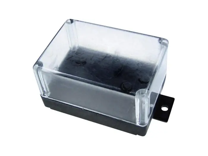 Apparatlåda (även kallad inbyggnadslåda eller kapsling) med transparent lock, för att skydda och kapsla in kretskort och elektroniska komponenter. Apparatlådan är tillverkad av svart termoplast. Den robusta plasten ger god mekanisk hållfasthet och ett grundläggande skydd mot damm och stänk.