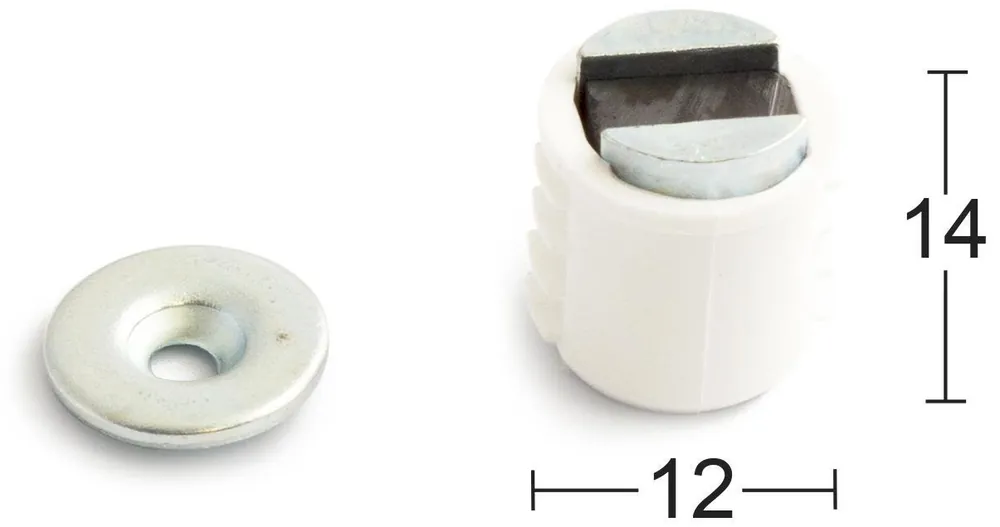 Magnetlås med magnethus av plast för inborrning. Ø 12 mm. Höjd 14 mm. Dragkraft: 2 kg. Levereras i förpackning om 2 st.