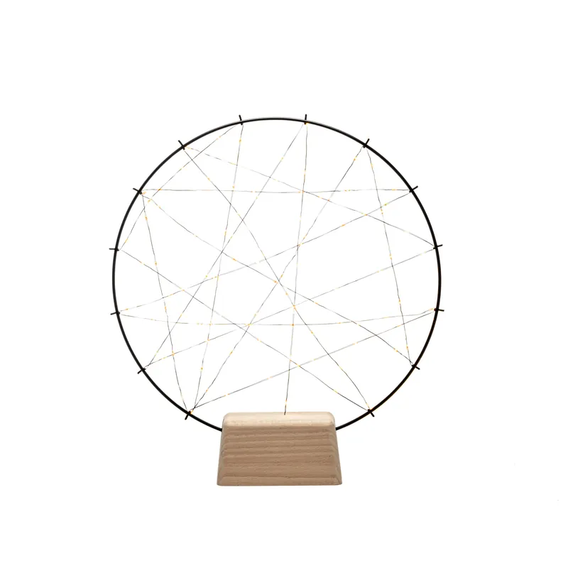Konstsmide 1783-787 är en rund svart metalldekoration med träbas, 100 amber micro LED, 4,5V/IP20.