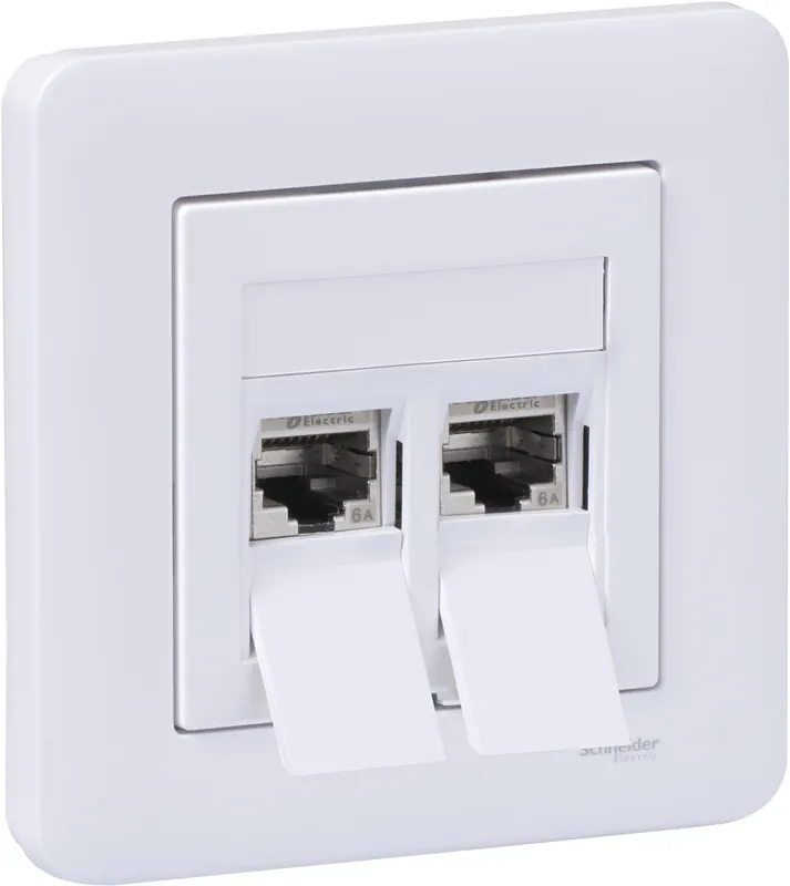Datauttag Exxact Kat 6A STP i rakt eller vinklat utförande, med eller utan ram. Anslutningssatsen innehåller 2 st Kat 6A STP S-One modularjack, 1 st plåtstödram för apparatdosa c/c 60 mm, 1 st vit plan/rak centrumplatta med dammluckor eller 1 st vit vinklad centrumplatta.