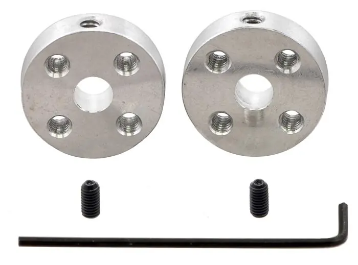 Nav för att fästa hjul, skivor eller andra mekaniska delar till en motoraxel med 5mm diameter, t.ex. en stegmotor. Varje nav har fyra gängade hål för M3-skruv. Navet fästs på motoraxeln med en stoppskruv (insexnyckel medföljer).