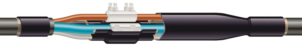 Kabelskarv för skarvning av plastisolerad jordkabel, 3- och 4-ledare, 1kV. Fasisolation och yttermantel är gjord av tjockväggig limförsedd krympslang. Skarven innehåller skruvskavhylsor typ BSL som täcker stort areaområde med få storlekar och kräver ej specialverktyg. Inklusive skruvskarvhylsor.