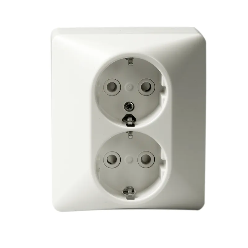 Infällt vägguttag med förhöjningsram för för utanpåliggande montage, IP 20. Alpinvit. Av slagtålig halogenfri polykarbonat. Snabbanslutning av ledarna om ej annat anges. Hel bottenplatta16A, 250V.