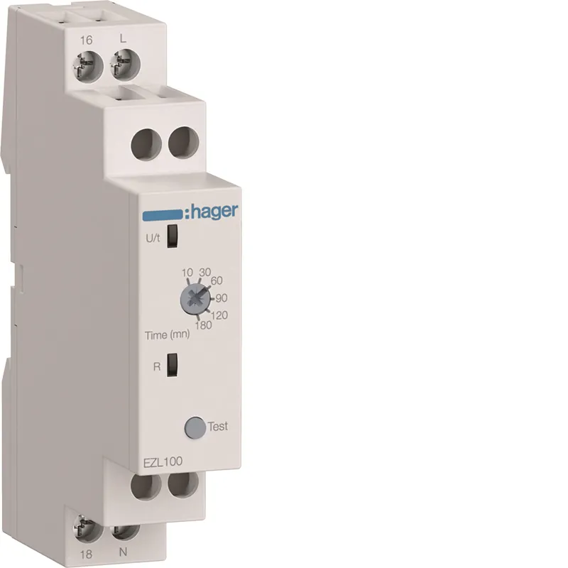 Hager tidrelä EZL100 är avsett för test av nödbelysning. Den integrerade potentiometern används för att ställa in fördröjningstiden, där tidsintervallet kan anges i sekunder eller timmar. Två status-LED visar matningsspänningen (U/t) respektive utgångsreläets status (R). Relädelen har en normalt sluten och en normalt öppen kontakt. Hagers sortiment av tidreläer omfattar flera konfigurationsalternativ och inställningar och finns för bostads-, kommersiella och industriella installationer.