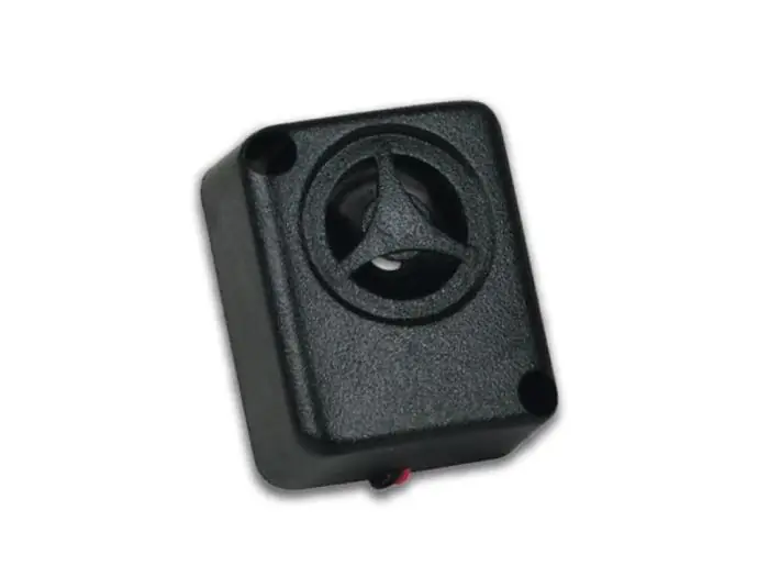 Liten effektiv larmsiren med en ljudstyrka på 115 dB. Kapsling i ABS-plast. Obehagligt pulserande ljud. Utanpåliggande montage.