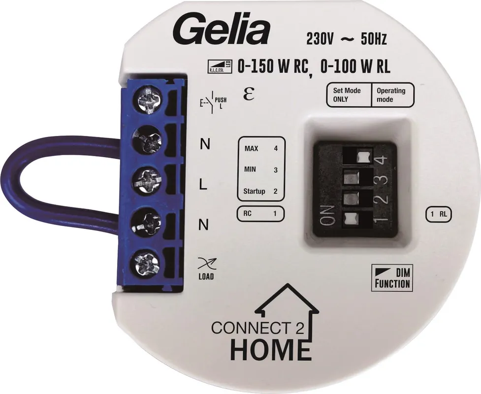 Dosdimmer/dimmerpuck med inställningar för min- och maxnivå och för lägsta startnivå. Omställningsbar dimmerteknik mellan framkant (RL) och bakkant (RC). Kräver nolla. Litet utförande för att kunna monteras i apparatdosa, bakom tryckknapp. Styrs med återfjädrande tryckkknappar. Med impulsfjädrar som passar till strömbrytare från Connect 2 Home, Elko och Schenider Electric. Dimmern klarar 0-150 W för elektroniska transformatorer och LED drvers (RC), LED drivers (RL), och kompaktlysrör med E14, E27 & GU10, samt glödljus och halogenlampor. Tillsammans med konventionella transformatorer för lågvolts halogen klarar dimmern 0-100 W.