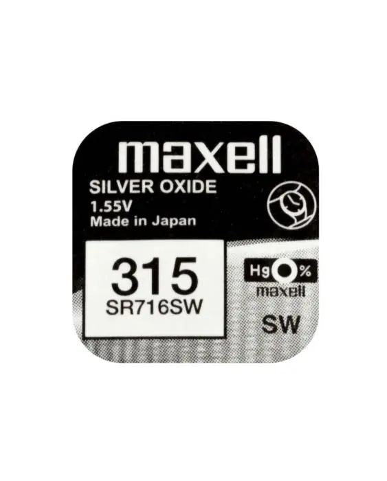 315 – SR716SW knappcellsbatteri. Maxell silveroxid-batterier är ett av marknadens bästa och säkraste val och föredras ofta av urmakare. Tillverkad i Japan. Ger en tillförlitlig och läckagesäker strömförsörjning för digitala och analoga armbandsur. Silveroxidbatterier används ofta i enheter med konstant och/eller låg energiförbrukning. Exempel är fjärrkontroller, wearables, sensorer, medicinsk utrustning, bilnycklar, miniräknare och mätinstrument. Silveroxid har stor tålighet mot värme och kyla och förblir stabil i temperaturförhållanden från -20 till +60 °C. Utformad för långvarig användning.