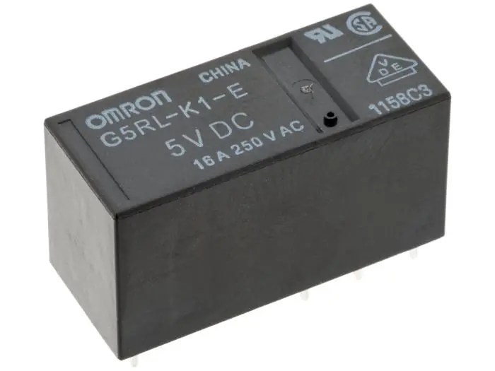 Bistabilt (latchande) relä med dubbellindad spole. En växlande kontakt NO/NC (SPDT) för kretskortsmontage. Dubbelspolen låser i sina lägen. Den har har tre anslutningar. Mittenbenet ansluts till drivspänning och genom att dra antingen det ena eller det andra ytterbenet mot jord växlar reläet sin kontakt. Kontakten hålls kvar efter att strömmen försvinner.