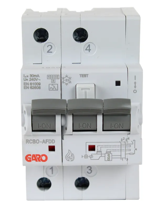 GARO AB personskyddsbrytare AFDD kombinerar jordfelsbrytare och dvärgbrytare med inbyggd ljusbågsdetektor, vilket innebär att apparaten både bryter vid jordfel och överström samt löser ut vid upptäckt av en ljusbåge. Enheten är av läckströmstyp A och manöverspänningstyp för hjälpkretsar är AC, med märkspänning 240 V och märkström 6 A samt nominell felström 0,03 A. Utlösningskarakteristiken är C och strömbegränsningsklass 3, och den nominella kortslutningskapaciteten enligt EN 61009 respektive IEC 60947-2 är 10 kA. Kapslingsklassen är IP20, överspänningskategori 3 och föroreningsgrad 2, och tillsatsapparatens märkspänning är 240 V; en brandskyddsbrytare levereras monterad vid leverans. Produkten har en bredd motsvarande 3 modulmellanrum och ett inbyggnadsdjup på 69 mm och är testad och certifierad av ett oberoende europeiskt testinstitut.
