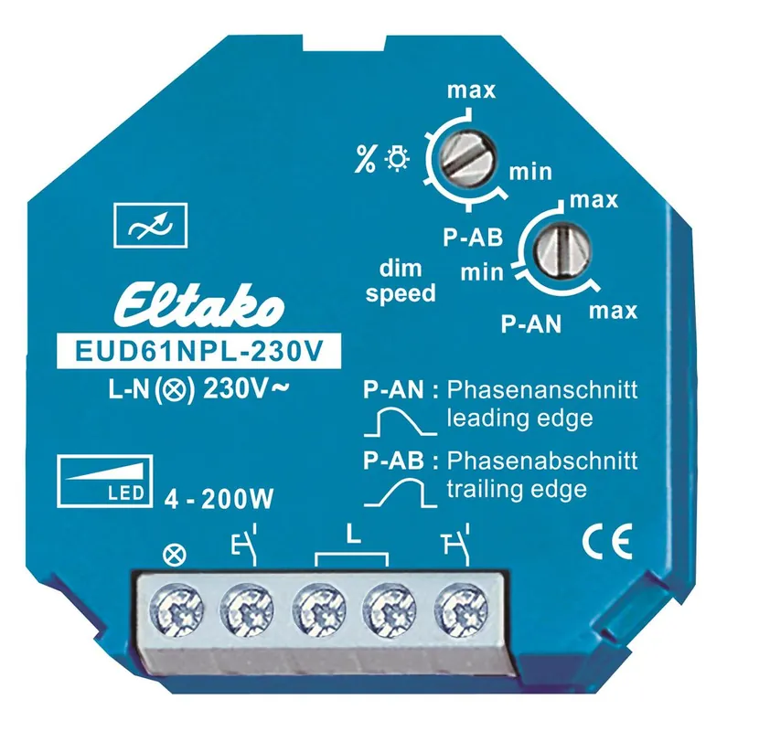 Power MOSFET upp till 200W. Standby förbrukning endast 0,5 watt. Inställbar för fram- eller bakkantsdimring samt minnesfunktion AV/PÅ Lägsta ljusnivå och dimringshastighet kan ställas in. Universell dimmer för R-och C-laster upp till 200W, beroende på ventilation Inga L-laster får dimras (induktiva laster som t.ex. konventionella transformatorer). Nollgenomgångsbrytning med mjuk PÅ och mjuk AV, för att spara lasten. Manöverspänning 230V. Min. last endast 4 W.