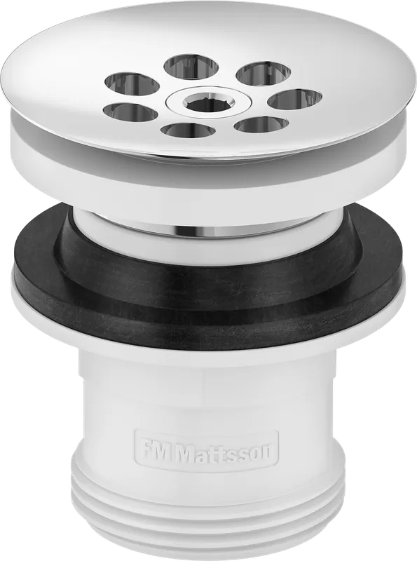 Blyfri silventil med bräddavlopp. Överdel i mässing och underdel i vit plast. Blyfri krom. 30-60 mm.