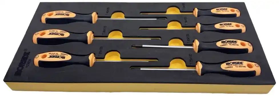 Innehåller 7 skruvmejslar; TX10-TX15-TX20-TX25-TX27-TX30-TX40. Specialhärdat krommolybdenvandistål. Svartoxiderad spets. Ergonomiskt skaft i tvåkomponentsmaterial.