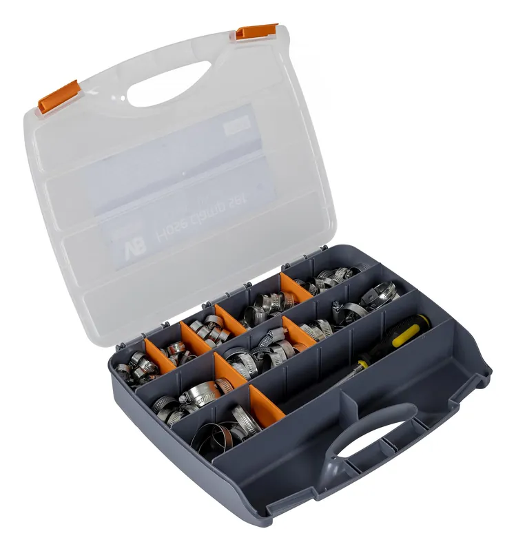 Pela 520235 är en slangklämsats med totalt 115 stycken slangklämmor (8-50 mm) i 9 stycken olika storlekar. Levereras i en sortimentslåda av plast med handtag. 1 styck skruvmejsel med flexibelt skaft medföljer.