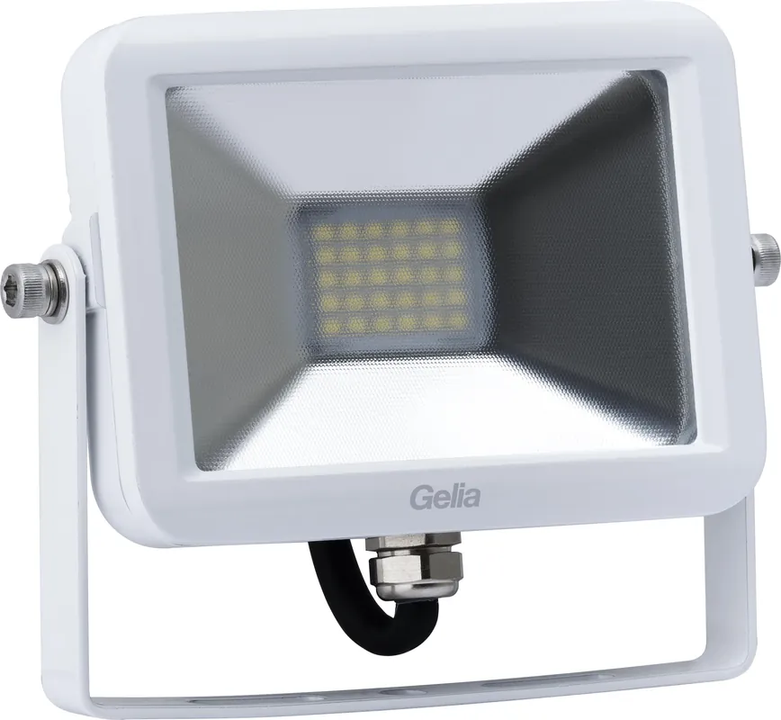 Gelia Tärno är en vit slimmad strålkastare med IP65 och frostat glas för att förhindra bländande ljus. Strålkastaren är försedd med ett ställbart väggfäste.
