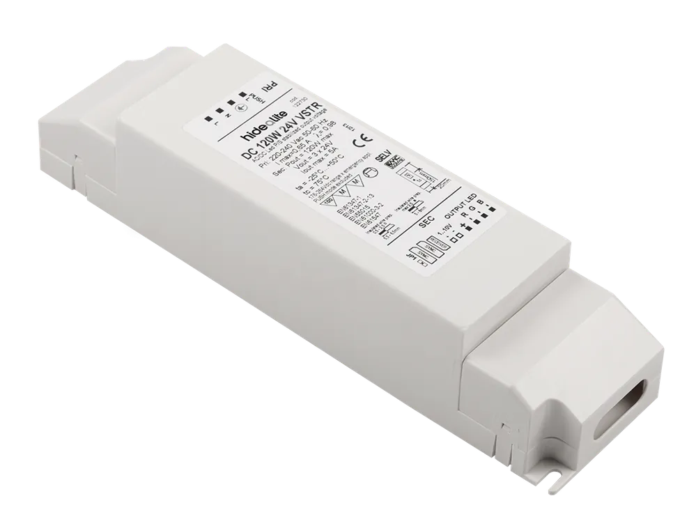 Hide-a-Lite DIM-trafo VSTR är ett kraftfullt styrdon som kan ljusregleras steglöst. 1-10 st enheter kan länkas och styras med fas-push från ett eller flera ställen via återfjädrande tryckknapp, via 1-10V eller bus-/KNX via aktor. VSTR har minnesfunktion som tänder upp enligt senast inställda värde vid spänningsbortfall. Tre utgångar med snabbplintar för enkel installation.