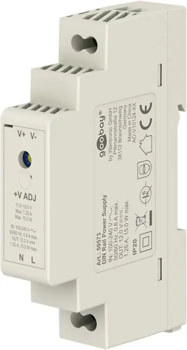 12V 1.25A 15W ställbart switchat nätaggregat för DIN-skena. En modul bred. Inbyggt skydd mot överspänning, kortslutning och överbelastning.