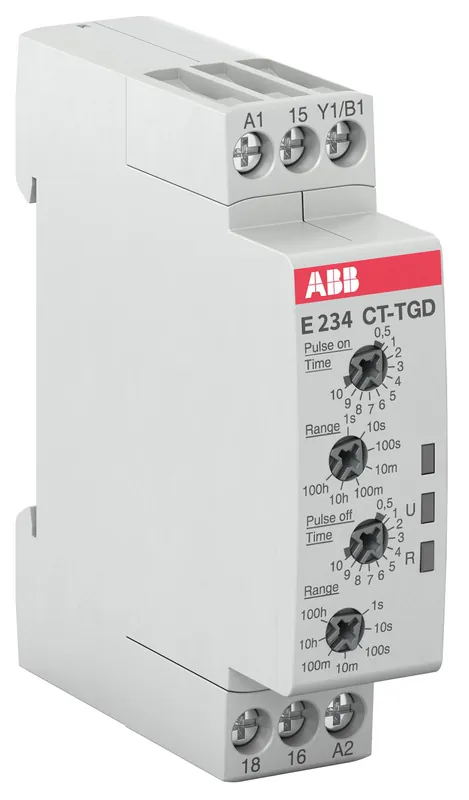 ABB pulsgenerator har en växlande kontakt och ett tidsområde från 0,05 s till 100 timmar, med manöverspänning 24–48 V DC eller 24–240 V AC. ABB pulsgenerator är avsedd för montage på DIN-skena och har skruvanslutning samt kapslingsklass IP20; märkström är 6 A. ABB pulsgenerator har måtten 17,5 mm i bredd, 70 mm i höjd och 63 mm i djup.