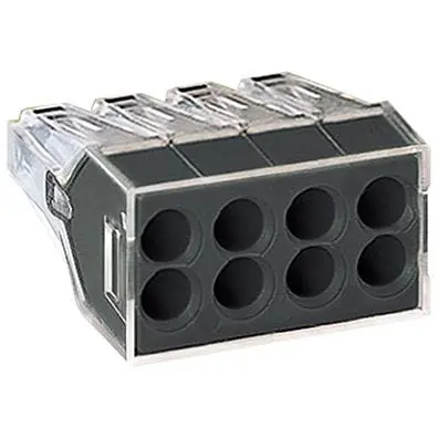 Wago 773-108 är en toppklämma för 8-ledare som kopplas så att avisolerade ledarändar (FK/EK) sticks in i den skruvlösa klämman. Färgkodning tillsammans med en transparent huv med testhål gör säkerheten synlig. Vrid ledare och drag vid demontering. Levereras i 50-pack.