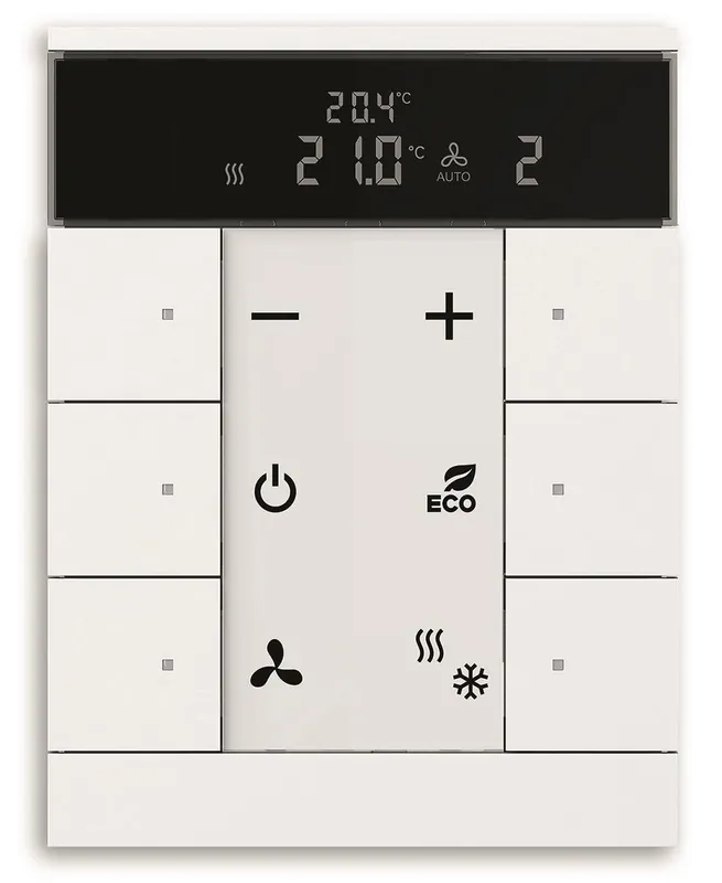 Fritt konfigurerbara multifunktions kontrollelement med RTC och integrerad KNX-buss kopplare. Med märknings fält. Stöd för KNX-funktioner genom innovativt färg koncept (gult = belysning, blått = blind, orange = RTC, magenta = scen och vit = neutral/ingen funktion tilldelad) eller standardbelysning röd/grön. Tempsensor.