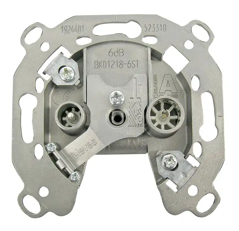 Serieuttag med två IEC-kontakter. Vänster kontakt är IEC-hane för TV och höger kontakt är IEC-hona för radio (FM). Tillåter genomgång som möjliggör anslutning av flera uttag i ett kaskadnät. Rekommenderat slututtag är Ref. 533211. DOCSIS 3.1 kompatibel.