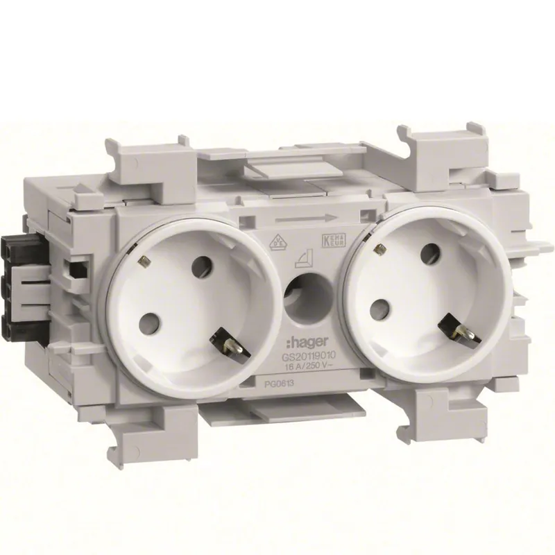 Hager GS20119016 är ett 2-vägsuttag, 230 V, 45°, till samtliga Hager kabelkanaler BRx. Wago- eller direktanslutning, frontmontering.