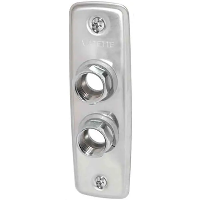 Vatette FG0125253 är en väggbricka för PEX-, AluPEX- och PB-rör. Väggbrickan ansluts med Vatette kopplingar/kulventil.