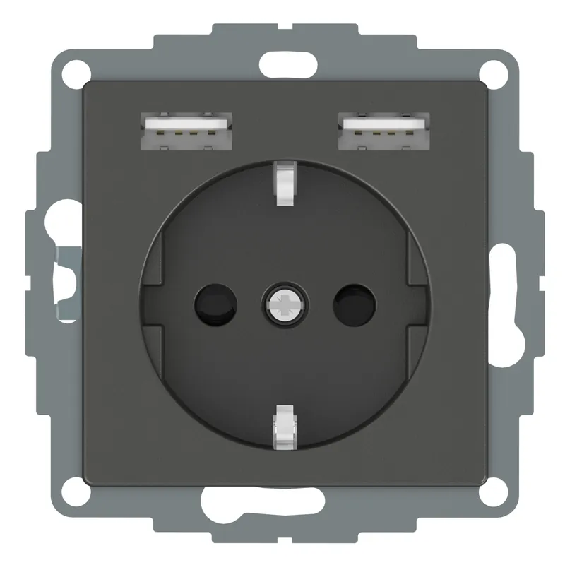 Exxact 1-vägsuttag med 2 x USB laddning 2,4A Typ A, jordat, snabbanslutning, inkl klor, petskyddat för infälld montering i apparatdosa c/c 60mm. För utanpåliggande montage används dosa 35mm. Kompletteras med valfri Exxact-ram.