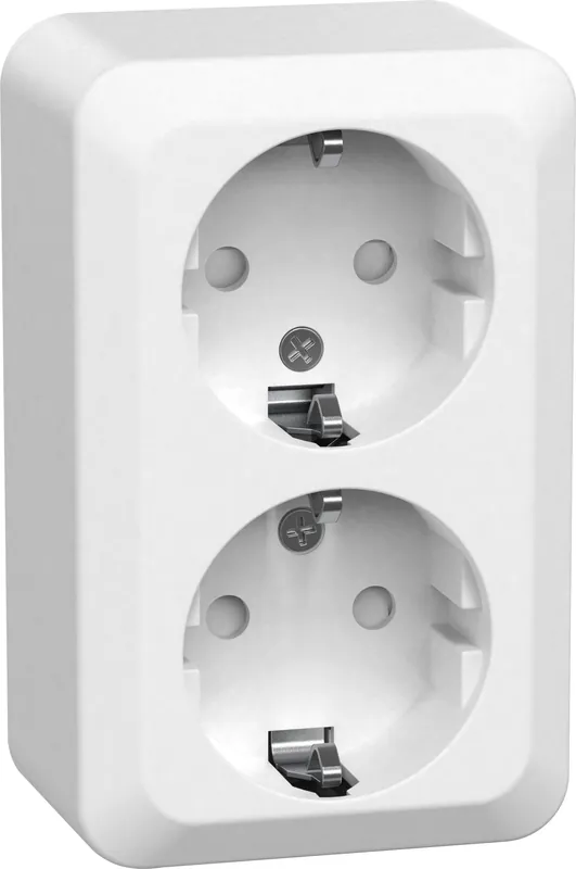 Vägguttag med petskydd. Dubbla anslutningar per skruvtillkoppling. Bottenplattan har ursparingsmarkeringar för 16 mm rör.