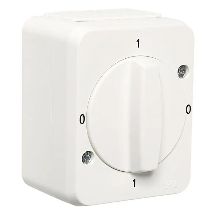 Elko EKO01662 är en 2-polig vridströmställare med kapsling av termoplast med genomgående införingshål med en enkel och en dubbel försluten membrannippel. Modellen har märkspänning 250 V och är halogenfri. För utanpåliggande montage.