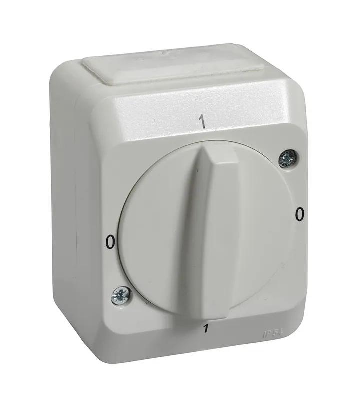 Vridströmställare för utanpåliggande IP44 montage med två membrannipplar. Med tydlig lägesindikering 1-0. Skruvanslutning. Två neutrala överkopplingsklämmor.