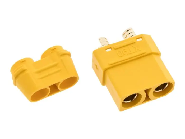 Kraftig kabelmonterad kontakt för spänningsmatning. Lödhylsor för kabel upp till AWG10 (5.3mm²). Polariserande kontakthus eliminerar risken för felaktig anslutning.