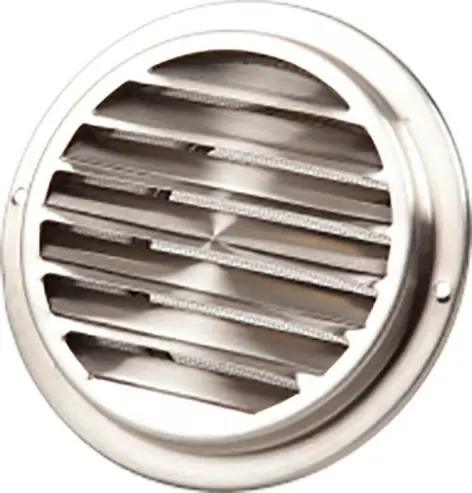 Cirkulär utvändig ventilationshuv/galler i rostfritt stål med attraktiv design som passar på den moderna fasaden. Anslutning direkt mot ventilationskanal. Kan användas för en mängd olika applikationer. Levereras med insektsnät och tillhörande skruv för montering.